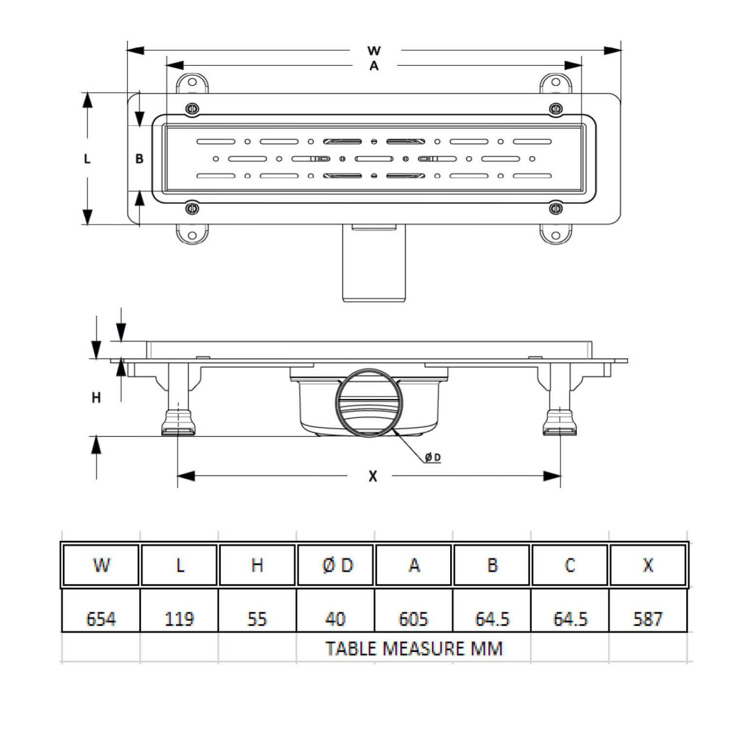 Descripcion 4025.TY040K.060.1 DESAGUE 60CM ACERO INOX PULIDO SALIDA HORIZ 40MM ANTI OLOR C/MEMBRANA