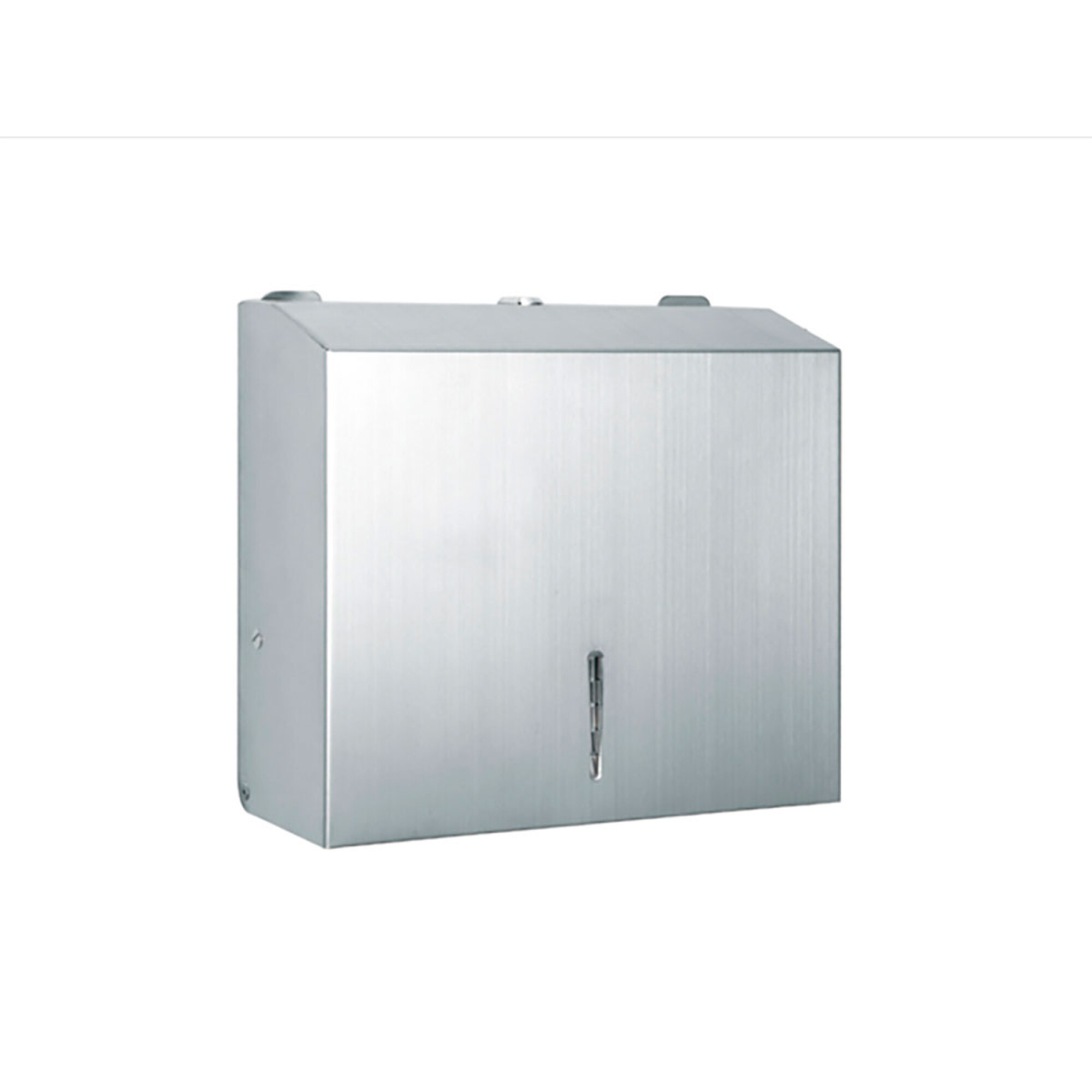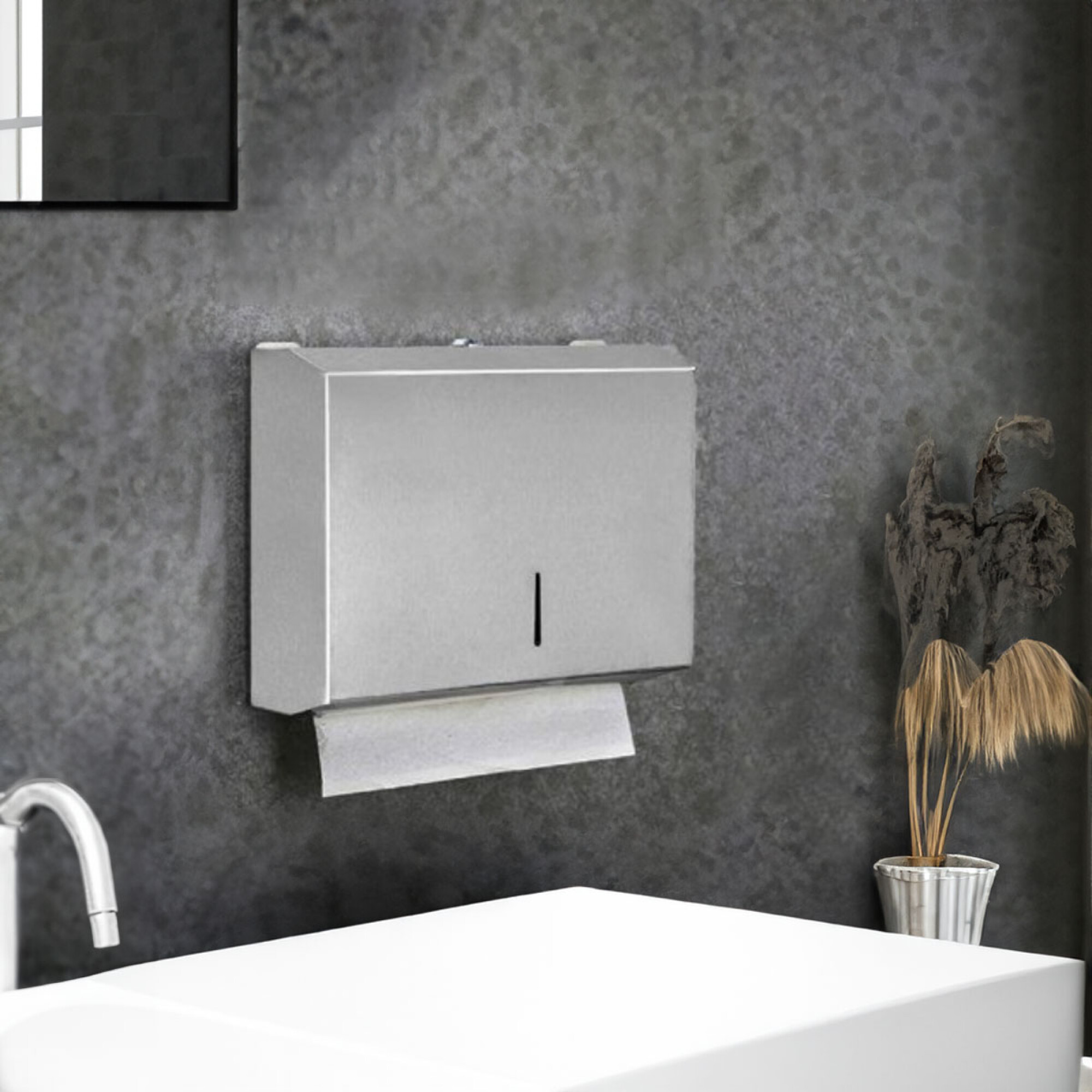 Dispensador de toallas de papel en acero inoxidable 304 satinado, perfecto para baños públicos y comerciales. Su diseño moderno y funcional ofrece una dispensación fácil y controlada de toallas de papel, mientras que su construcción en acero inoxidable garantiza resistencia y durabilidad.