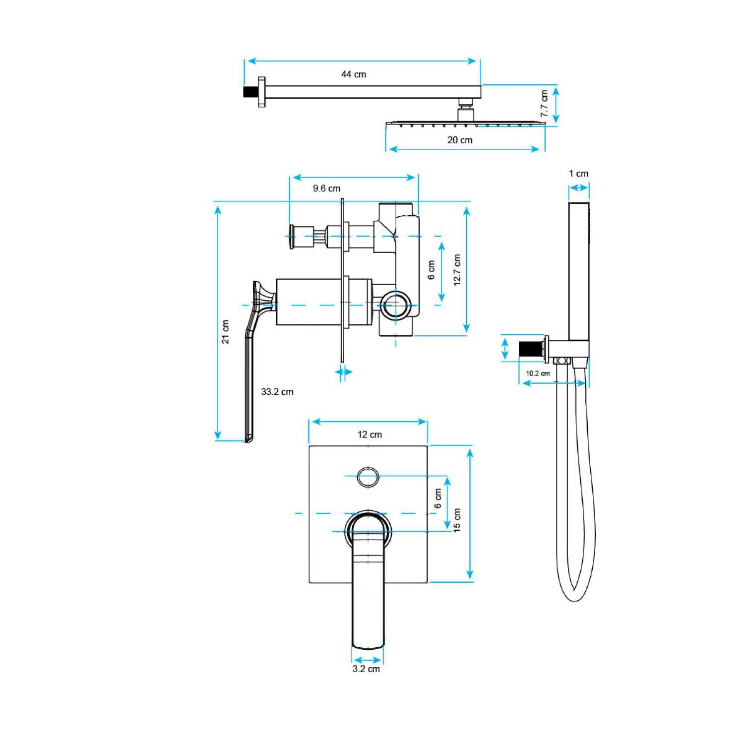 La ducha de embutir modelo Modena de Aqualia, referencia AQ548212-N, destaca por su elegante acabado en negro mate. Este conjunto incluye una roseta, brazo, teléfono de ducha, soporte y un sistema de transferencia. Su diseño monocomando permite un control preciso de la temperatura y el flujo de agua. Ideal para baños modernos, su instalación empotrada proporciona una apariencia limpia y minimalista. Fabricada con materiales de alta calidad, esta ducha garantiza durabilidad y resistencia, haciendo de cada ducha una experiencia placentera y estilizada.