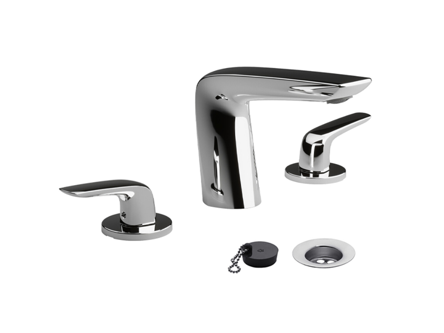 Grifería bimando de lavatorio de la línea Epuyén de FV, acabado cromo. Este grifo para lavabo ofrece un diseño contemporáneo y funcional, con dos manijas independientes para controlar el flujo de agua fría y caliente. Fabricado con materiales resistentes, este grifo garantiza un rendimiento duradero y confiable, agregando estilo y comodidad a cualquier baño.