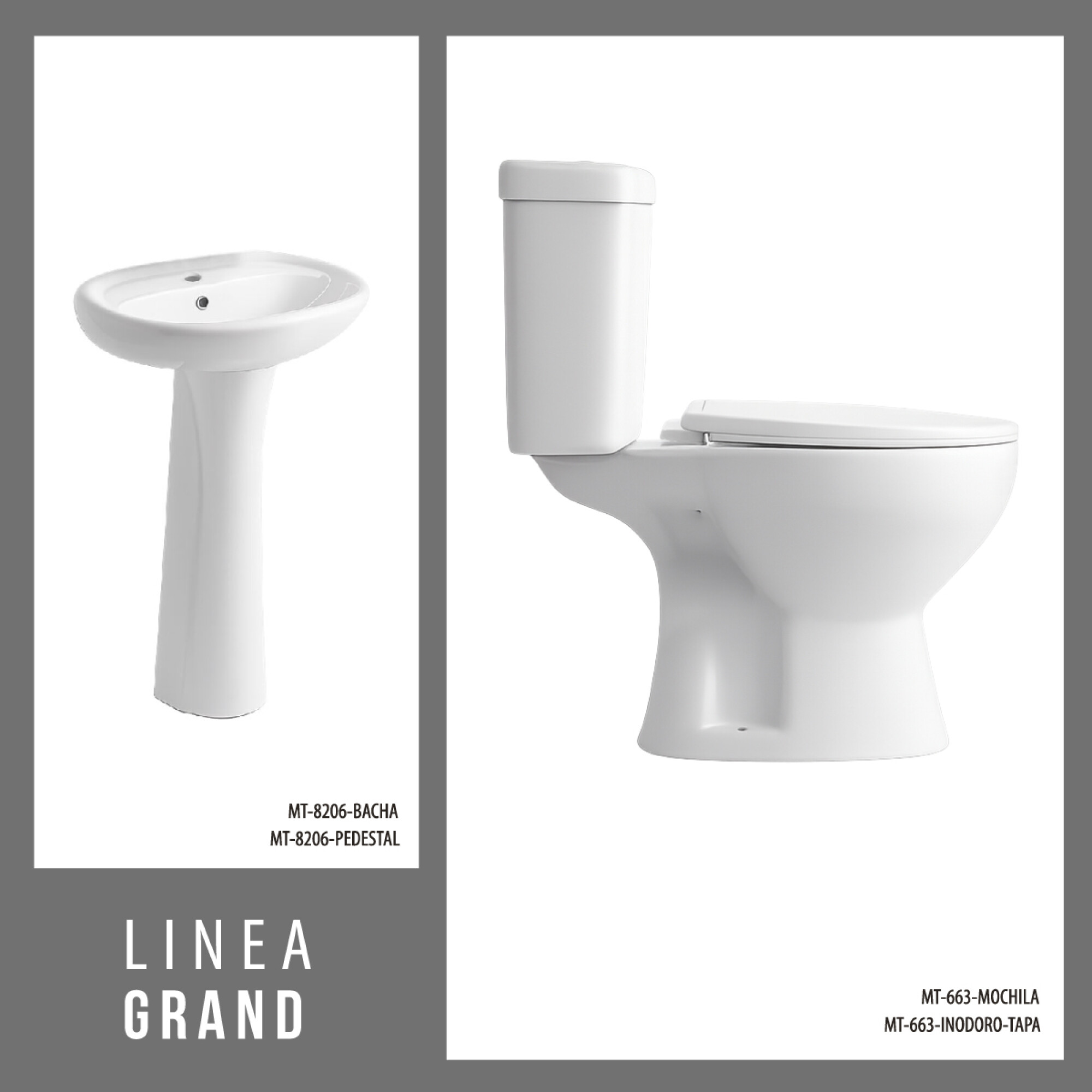 El juego sanitario completo DGC Grand ofrece una solución integral para equipar el baño con estilo y funcionalidad. Incluye inodoro con tapa de cierre suave, mochila de descarga eficiente, bacha de apoyo y pedestal a juego, todo fabricado en loza blanca brillante. Su diseño uniforme crea una estética armónica y moderna, ideal para proyectos residenciales o comerciales. La mochila optimiza el consumo de agua, mientras que el pedestal aporta estabilidad y elegancia. Este conjunto representa practicidad, durabilidad y un acabado sofisticado para baños completos.