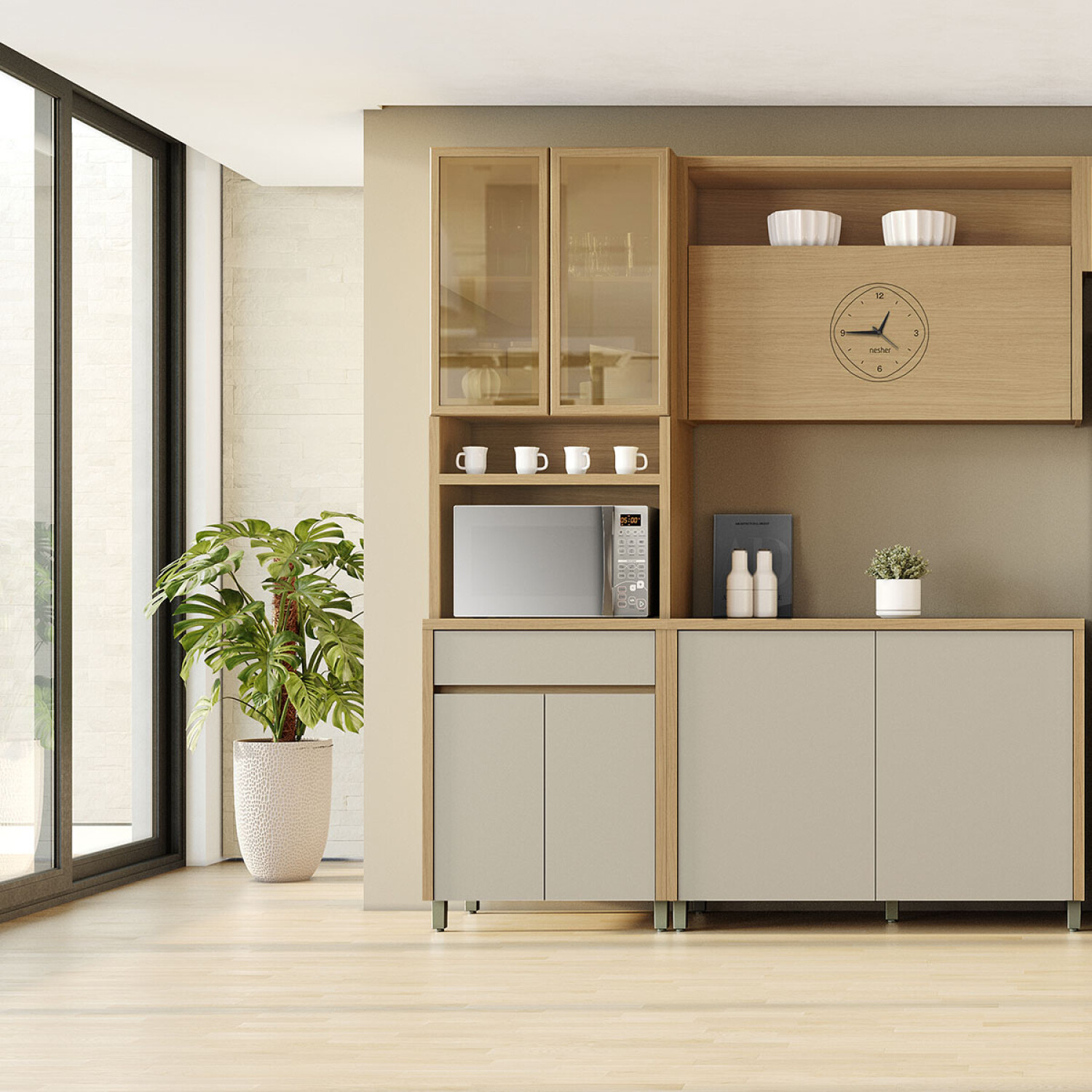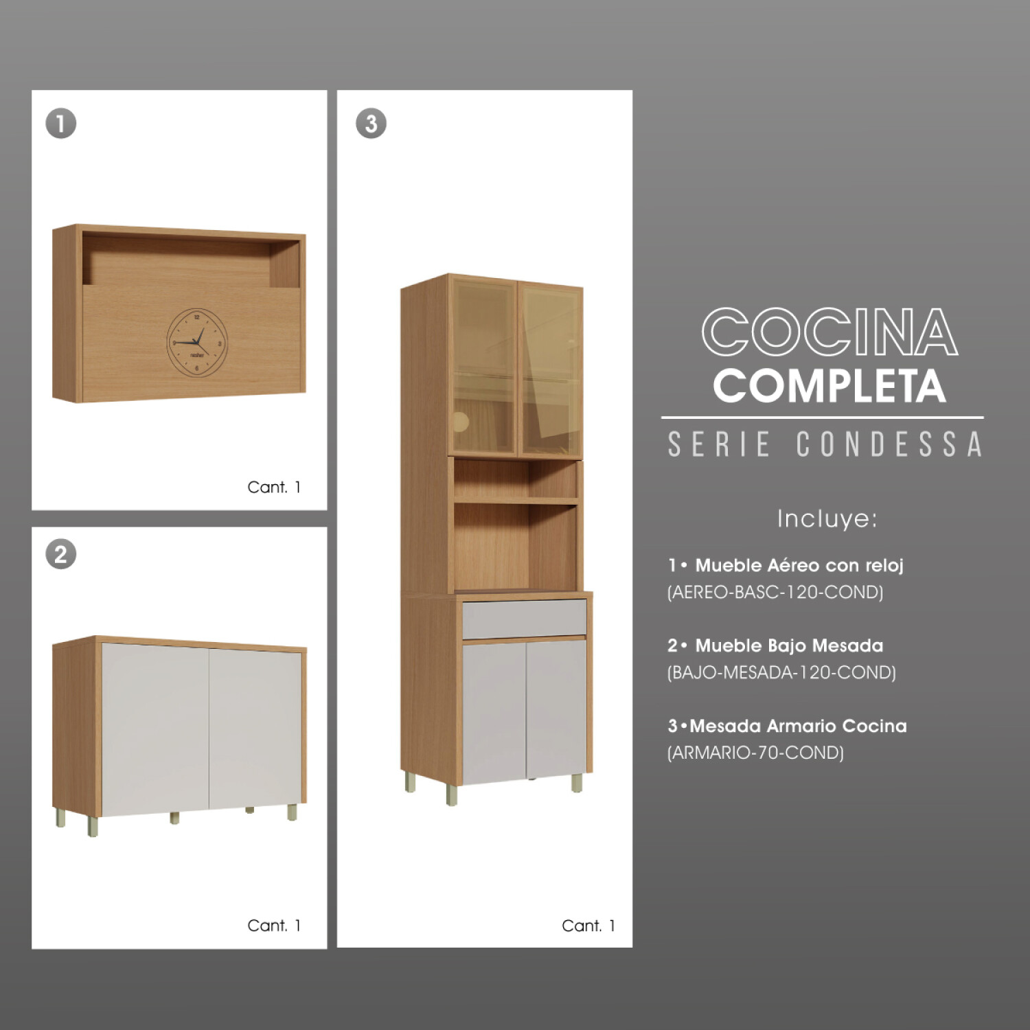 El juego modular Condessa C incluye un aéreo de 120 cm, un bajo mesada de 120 cm y una torre para horno o microondas, configurando un set completo y funcional para equipar cocinas medianas o grandes con diseño uniforme y moderno. Fabricado en MDF con terminación beige cálida, aporta luminosidad y combina con mesadas en madera, blancos o cementos. El aéreo permite organizar vajilla y alimentos secos, el bajo mesada ofrece espacio para ollas y utensilios grandes, y la torre integra horno o microondas optimizando ergonomía y accesibilidad. Fabricado por Nesher con herrajes de apertura suave, garantiza estética, siendo la solución ideal para proyectos residenciales o modulares que prioricen practicidad, organización y diseño sobrio en un solo set.