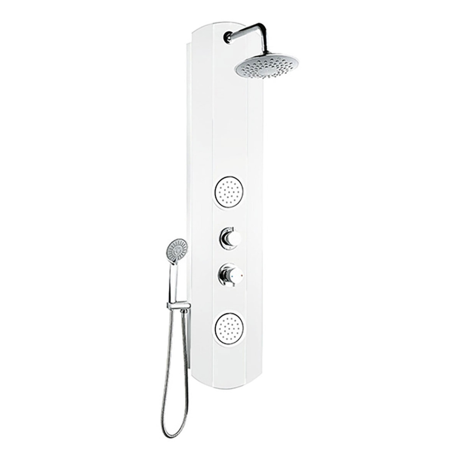 Panel de ducha PVC blanco lacado con jets de ABS cromado, fabricado por Aqualia. Este panel de ducha ofrece una experiencia de baño lujosa y relajante, con un diseño elegante y contemporáneo. Perfecto para instalaciones de baño que buscan incorporar tecnología de hidromasaje y estética moderna en su diseño.
