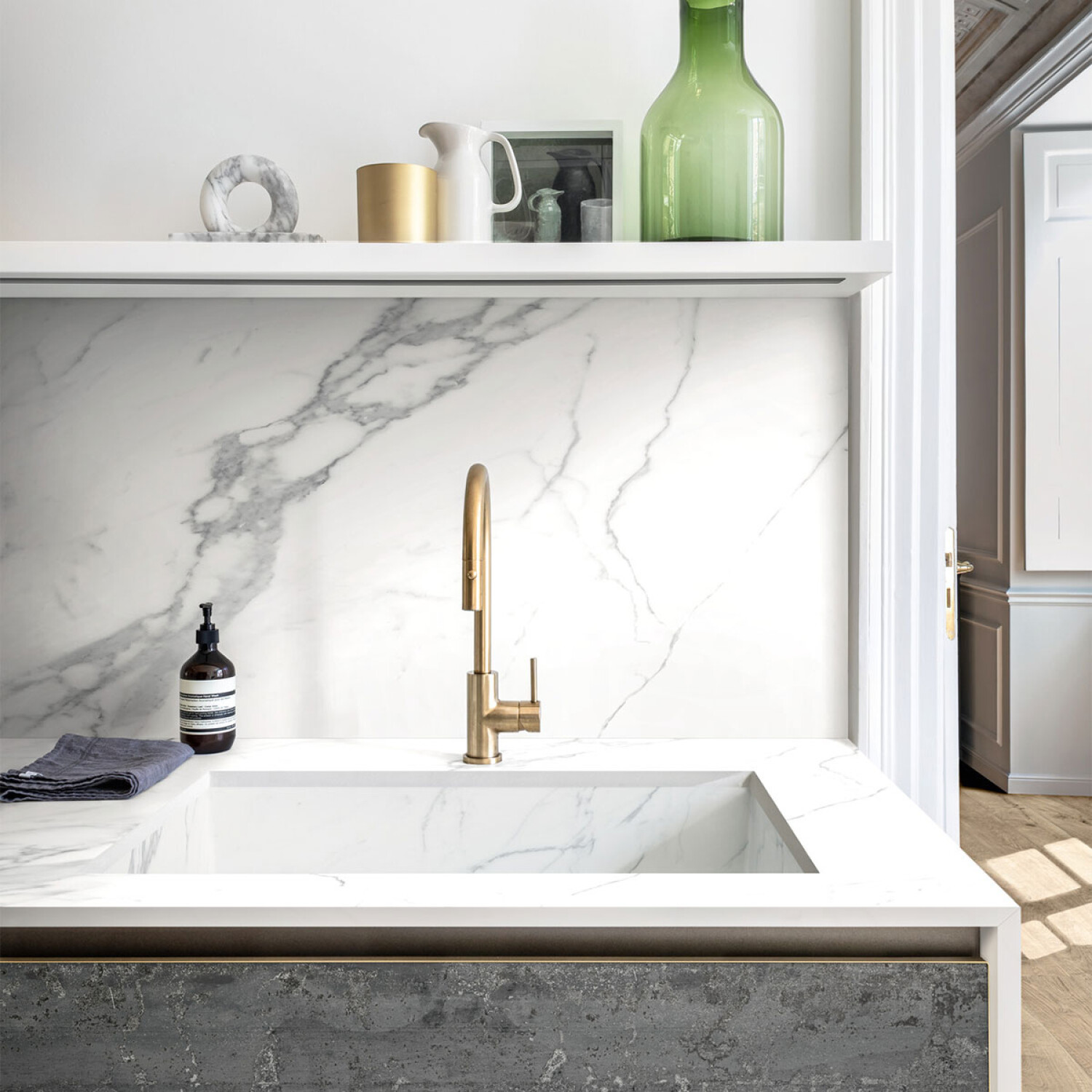 Porcelanato de gran formato de la serie The Top de Marazzi, modelo STATUARIO-LUX, en medidas de 162x324 cm y 12 mm de espesor. Este porcelanato es perfecto para pisos, revestimientos y mesadas de cocina, brindando una opción versátil y lujosa. Con su acabado inspirado en el mármol Statuario, aporta una apariencia sofisticada y atemporal a cualquier espacio. Ideal para proyectos de alto nivel que buscan una combinación de estética y resistencia, logrando una superficie continua que amplía visualmente el espacio. Recomendado para interiores elegantes y funcionales.