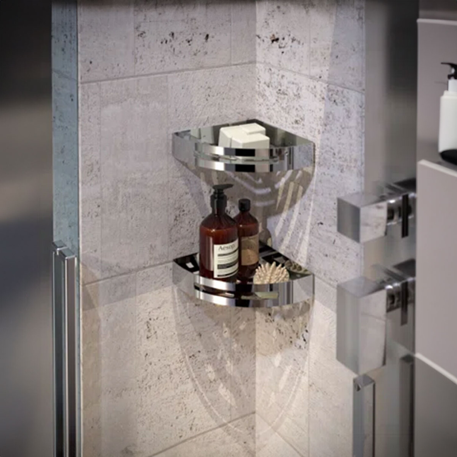 Repisa triangular esquinera en acero inoxidable 304 cromado, ideal para aprovechar al máximo el espacio en tu baño con estilo.